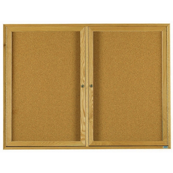 Red Oak Enclosed Bulletin Boards are made of Solid North American Red Oak, and are milled to perfection with hairline miters at the corners sturdily fastened for a durable long life. The neutral Natural Pebble Grain Cork back panel easily blends with any decor. Finish: High Gloss Clear Lacquer Size 48"Hx72"W 2 Doors