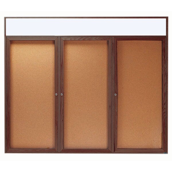 Red Oak Enclosed Bulletin Boards are made of Solid North American Red Oak, and are milled to perfection with hairline miters at the corners sturdily fastened for a durable long life. Supplied with a blank header panel, ready for your custom vinyl lettering. Lettering is not included and must be applied by the customer. The neutral Natural Pebble Grain Cork back panel easily blends with any decor. Finish: Walnut Stained Size 48"Hx72"W 3 Doors