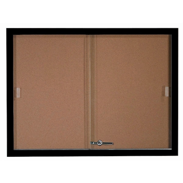This enclosed bulletin board has an extruded Aluminum frame and sliding doors providing a large display area. The neutral natural pebble grain cork back panel blends nicely with any dcor. Frame Black Powder Coat Size 36"Hx48"W