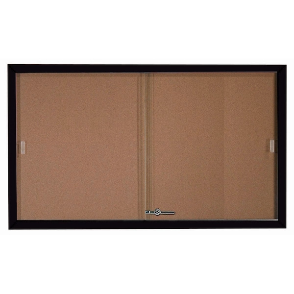 This enclosed bulletin board has an extruded Aluminum frame and sliding doors providing a large display area. The neutral natural pebble grain cork back panel blends nicely with any dcor. Frame Black Powder Coat Size 36"Hx60"W
