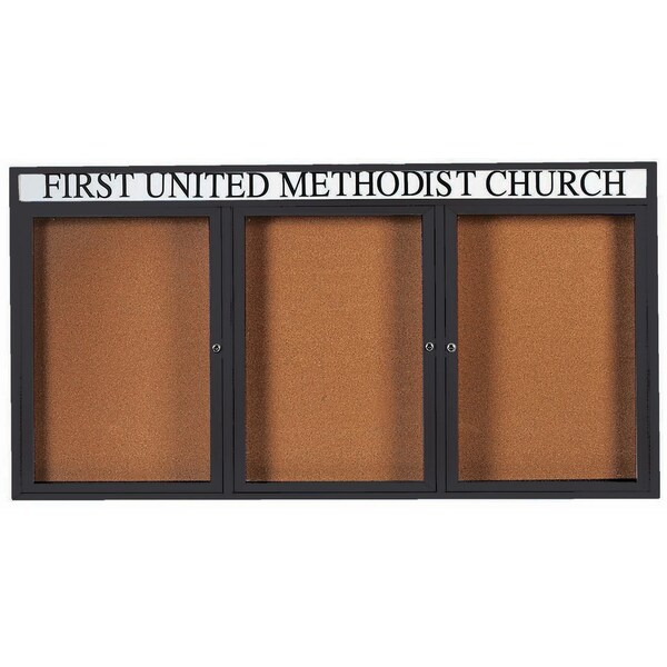 Enclosed Aluminum Bulletin Boards are made of custom extruded parts engineered to provide accurate, durable and handsome cabinets. All corners are neatly mitered and assembled with Heavy duty reinforcements and fasteners. Back panel is natural pebble grain cork. Supplied with a blank header panel, ready for your custom vinyl lettering. Lettering is not included and must be applied by the customer. Black Powder Coated Finish Size 36"Hx72"W 3 Doors