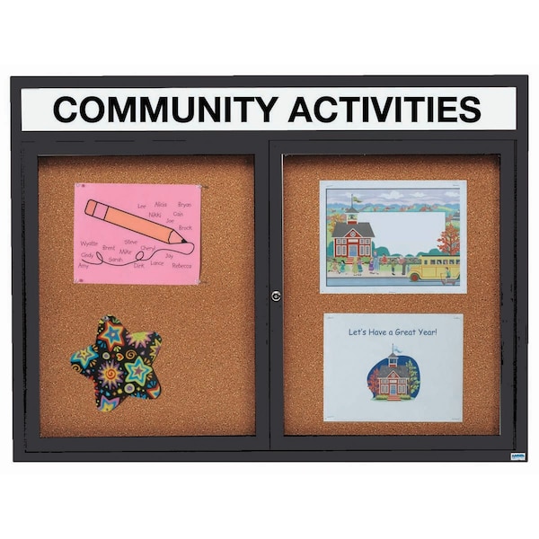 Enclosed Aluminum Bulletin Boards are made of custom extruded parts engineered to provide accurate, durable and handsome cabinets. All corners are neatly mitered and assembled with Heavy duty reinforcements and fasteners. Back panel is natural pebble grain cork. Supplied with a blank header panel, ready for your custom vinyl lettering. Lettering is not included and must be applied by the customer. Black Powder Coated Finish Size 48"Hx60"W 2 Doors