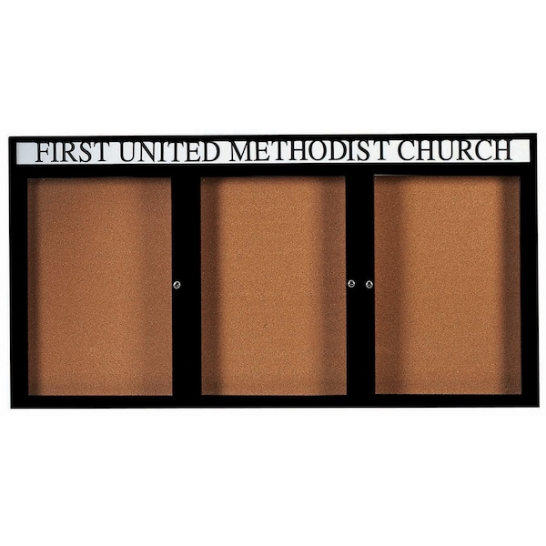 Enclosed Aluminum Bulletin Boards are made of custom extruded parts engineered to provide accurate, durable and handsome cabinets. All corners are neatly mitered and assembled with Heavy duty reinforcements and fasteners. Back panel is natural pebble grain cork. Supplied with a blank header panel, ready for your custom vinyl lettering. Lettering is not included and must be applied by the customer. Black Powder Coated Finish Size 48"Hx96"W 3 Doors