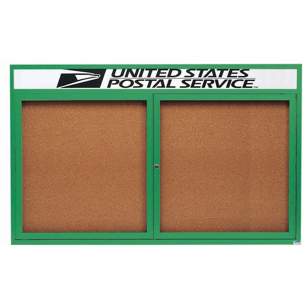 Enclosed Aluminum Bulletin Boards are made of custom extruded parts engineered to provide accurate, durable and handsome cabinets. All corners are neatly mitered and assembled with Heavy duty reinforcements and fasteners. Back panel is natural pebble grain cork. Supplied with a blank header panel, ready for your custom vinyl lettering. Lettering is not included and must be applied by the customer. Green Powder Coated Finish Size 36"Hx60"W 2 Doors