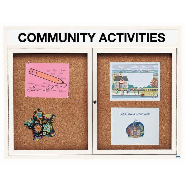 Enclosed Aluminum Bulletin Boards are made of custom extruded parts engineered to provide accurate, durable and handsome cabinets. All corners are neatly mitered and assembled with Heavy duty reinforcements and fasteners. Back panel is natural pebble grain cork. Supplied with a blank header panel, ready for your custom vinyl lettering. Lettering is not included and must be applied by the customer. White Powder Coated Finish Size 48"Hx60"W 2 Doors