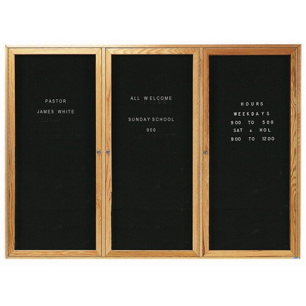 Red Oak Enclosed Changeable Letter Boards are made of Solid North American Red Oak, and are milled to perfection with hairline miters at the corners sturdily fastened for a durable long life. Black felt covered grooved letter panel accepts plastic letters with tabs positioned on 1/4" centers. Finish: High Gloss Clear Lacquer Size 48"Hx72"W 3 Doors