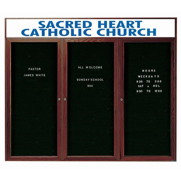 Red Oak Enclosed Changeable Letter Boards are made of Solid North American Red Oak, and are milled to perfection with hairline miters at the corners sturdily fastened for a durable long life. Supplied with a blank header panel, ready for your custom vinyl lettering. Lettering is not included and must be applied by the customer. Black felt covered grooved letter panel accepts plastic letters with tabs positioned on 1/4" centers. Finish: Walnut Stained Size 48"Hx72"W 3 Doors