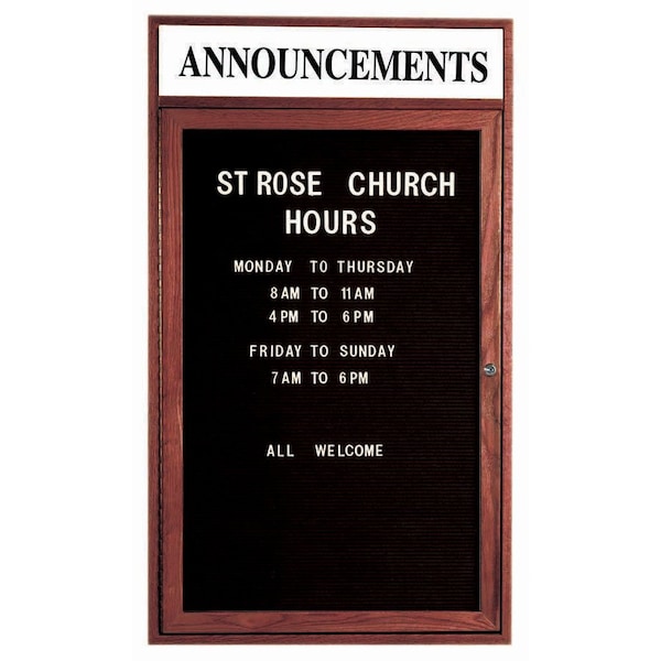 Red Oak Enclosed Changeable Letter Boards are made of Solid North American Red Oak, and are milled to perfection with hairline miters at the corners sturdily fastened for a durable long life. Supplied with a blank header panel, ready for your custom vinyl lettering. Lettering is not included and must be applied by the customer. Black felt covered grooved letter panel accepts plastic letters with tabs positioned on 1/4" centers. Finish: Cherry Stained Size 36"Hx24"W 1 Door