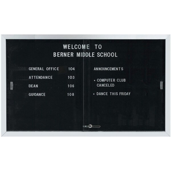 This enclosed directory board has an extruded Aluminum frame and sliding doors providing a large display area. The rear panel is a black felt covered grooved letter panel that accepts plastic letters with tabs positioned at 1/4" centers. Clear Satin Anodized Size 36"Hx60"W
