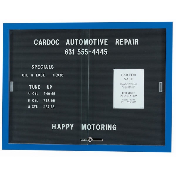 This enclosed directory board has an extruded Aluminum frame and sliding doors providing a large display area. The rear panel is a black felt covered grooved letter panel that accepts plastic letters with tabs positioned at 1/4" centers. Frame Blue Powder Coated Size 36"Hx48"W