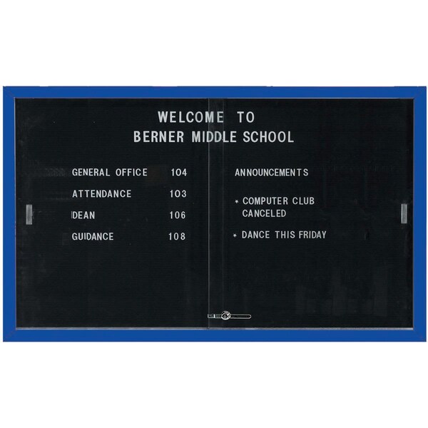 This enclosed directory board has an extruded Aluminum frame and sliding doors providing a large display area. The rear panel is a black felt covered grooved letter panel that accepts plastic letters with tabs positioned at 1/4" centers. Clear Blue Powder Coated Size 36"Hx60"W
