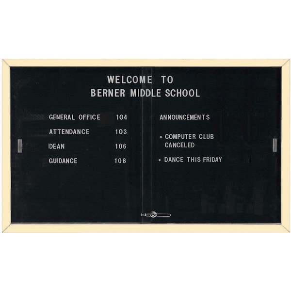 This enclosed directory board has an extruded Aluminum frame and sliding doors providing a large display area. The rear panel is a black felt covered grooved letter panel that accepts plastic letters with tabs positioned at 1/4" centers. Frame Ivory Powder Coated Size 36"Hx60"W