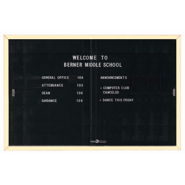 This enclosed directory board has an extruded Aluminum frame and sliding doors providing a large display area. The rear panel is a black felt covered grooved letter panel that accepts plastic letters with tabs positioned at 1/4" centers. Frame Ivory Powder Coated Size 48"Hx72"W