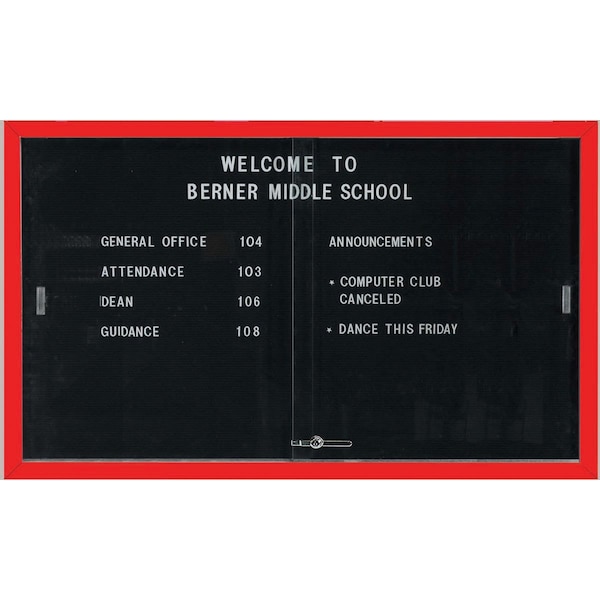 This enclosed directory board has an extruded Aluminum frame and sliding doors providing a large display area. The rear panel is a black felt covered grooved letter panel that accepts plastic letters with tabs positioned at 1/4" centers. Clear Red Powder Coated Size 36"Hx60"W