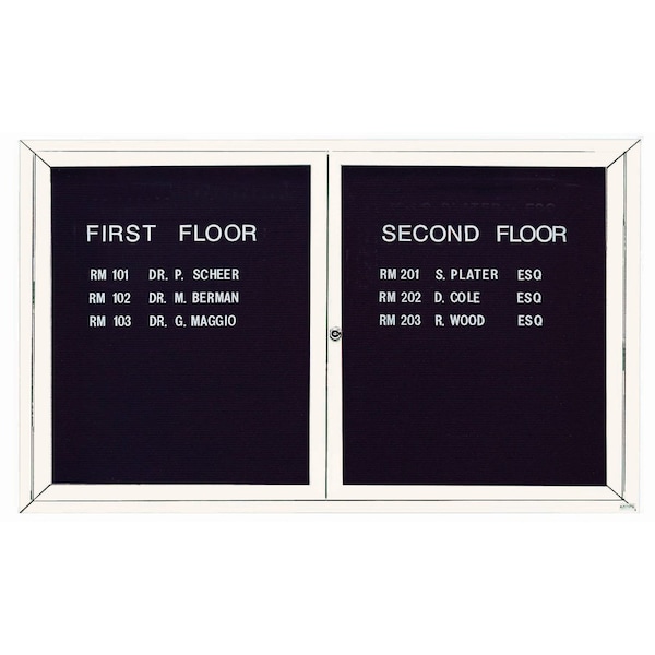 Enclosed Aluminum Directory Boards are made of custom extruded parts engineered to provide accurate, durable and handsome cabinets. All corners are neatly mitered and assembled with Heavy duty reinforcements and fasteners. The black felt covered grooved rear panel designed to accommodate changeable letters with tabs spaced on 1/4" centers. White Powder Coated Finish Size 36"Hx60"W 2 Doors