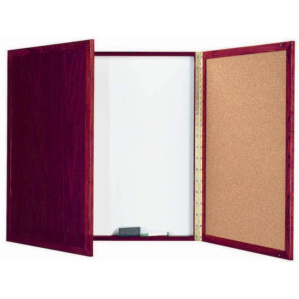 - Enclosed White Melamine Markerboard Center Panel and Natural Grain Pebble Cork inside the doors