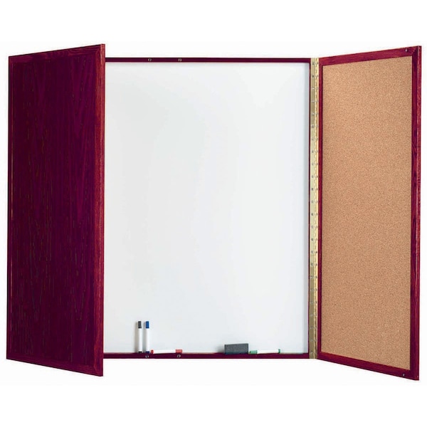 - Enclosed White Melamine Markerboard Center Panel and Natural Grain Pebble Cork inside the doors