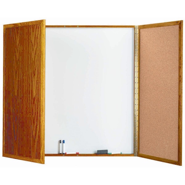 - Enclosed White Melamine Markerboard Center Panel and Natural Grain Pebble Cork inside the doors