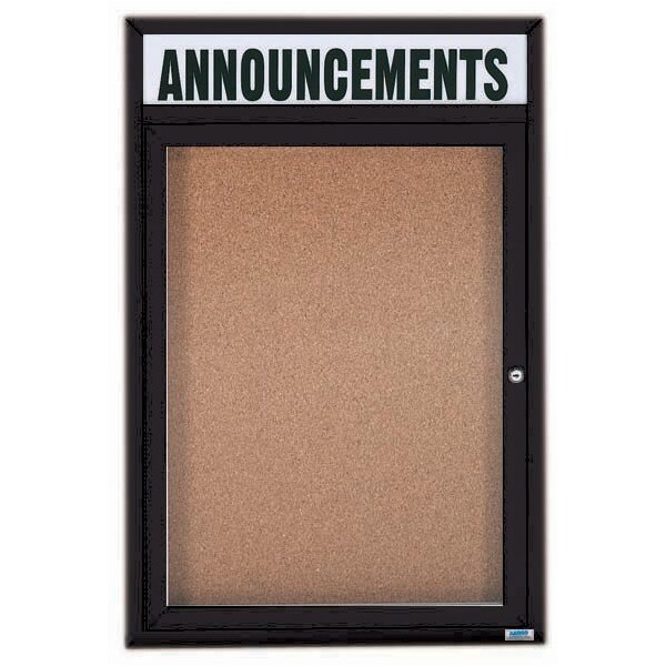 Enclosed Aluminum Bulletin Boards are made of custom extruded parts engineered to provide accurate, durable and handsome cabinets. All corners are neatly mitered and assembled with Heavy duty reinforcements and fasteners. Back panel is natural pebble grain cork. Supplied with a blank header panel, ready for your custom vinyl lettering. Lettering is not included and must be applied by the customer. Black Powder Coated Finish Size 24"Hx18"W 1 Door