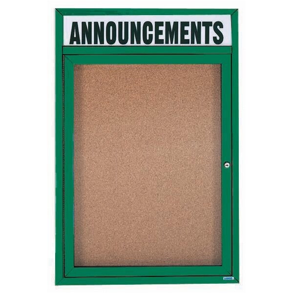 Enclosed Aluminum Bulletin Boards are made of custom extruded parts engineered to provide accurate, durable and handsome cabinets. All corners are neatly mitered and assembled with Heavy duty reinforcements and fasteners. Back panel is natural pebble grain cork. Supplied with a blank header panel, ready for your custom vinyl lettering. Lettering is not included and must be applied by the customer. Green Powder Coated Finish Size 24"Hx18"W 1 Door