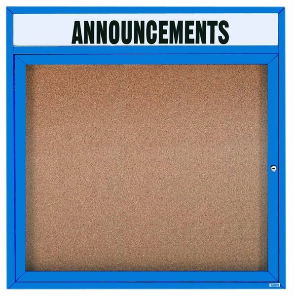 Enclosed Aluminum Bulletin Boards are made of custom extruded parts engineered to provide accurate, durable and handsome cabinets. All corners are neatly mitered and assembled with Heavy duty reinforcements and fasteners. Back panel is natural pebble grain cork. Supplied with a blank header panel, ready for your custom vinyl lettering. Lettering is not included and must be applied by the customer. Blue Powder Coated Finish Size 36"Hx36"W 1 Door