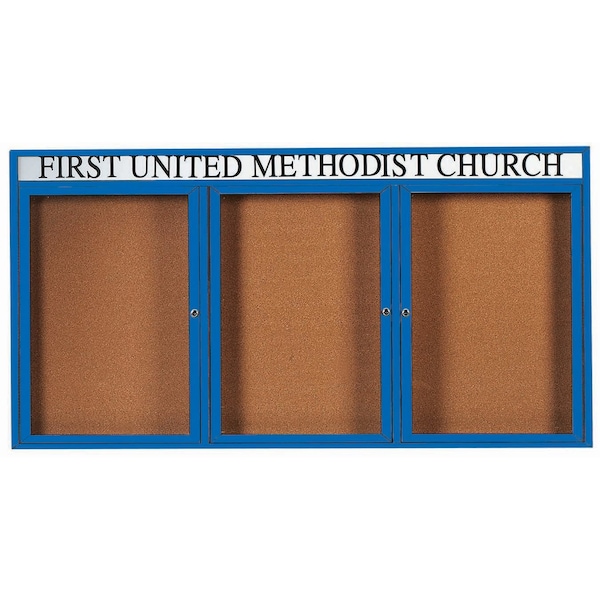 Enclosed Aluminum Bulletin Boards are made of custom extruded parts engineered to provide accurate, durable and handsome cabinets. All corners are neatly mitered and assembled with Heavy duty reinforcements and fasteners. Back panel is natural pebble grain cork. Supplied with a blank header panel, ready for your custom vinyl lettering. Lettering is not included and must be applied by the customer. Blue Powder Coated Finish Size 48"Hx96"W 3 Doors