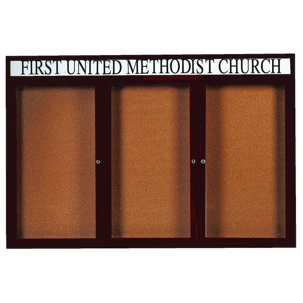 Enclosed Aluminum Bulletin Boards are made of custom extruded parts engineered to provide accurate, durable and handsome cabinets. All corners are neatly mitered and assembled with Heavy duty reinforcements and fasteners. Back panel is natural pebble grain cork. Supplied with a blank header panel, ready for your custom vinyl lettering. Lettering is not included and must be applied by the customer. Finish Bronze Satin Anodized Size 48"Hx72"W 3 Doors