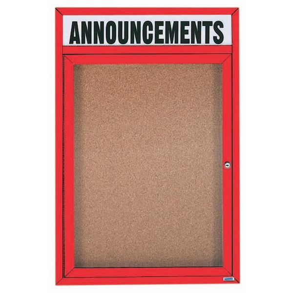 Enclosed Aluminum Bulletin Boards are made of custom extruded parts engineered to provide accurate, durable and handsome cabinets. All corners are neatly mitered and assembled with Heavy duty reinforcements and fasteners. Back panel is natural pebble grain cork. Supplied with a blank header panel, ready for your custom vinyl lettering. Lettering is not included and must be applied by the customer. Red Powder Coated Finish Size 36"Hx24"W 1 Door