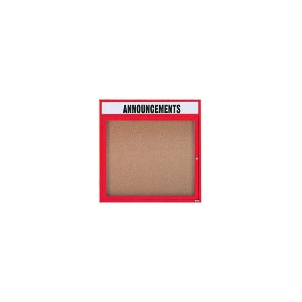 Enclosed Aluminum Bulletin Boards are made of custom extruded parts engineered to provide accurate, durable and handsome cabinets. All corners are neatly mitered and assembled with Heavy duty reinforcements and fasteners. Back panel is natural pebble grain cork. Add your personal inscription with a header which is standard black cut vinyl in Clear Gothic typeface on white acrylic. Supplied with a blank header panel, ready for your custom vinyl lettering. Lettering is not included and must be applied by the customer. Red Powder Coated Finish Size 36"Hx36"W 1 Door