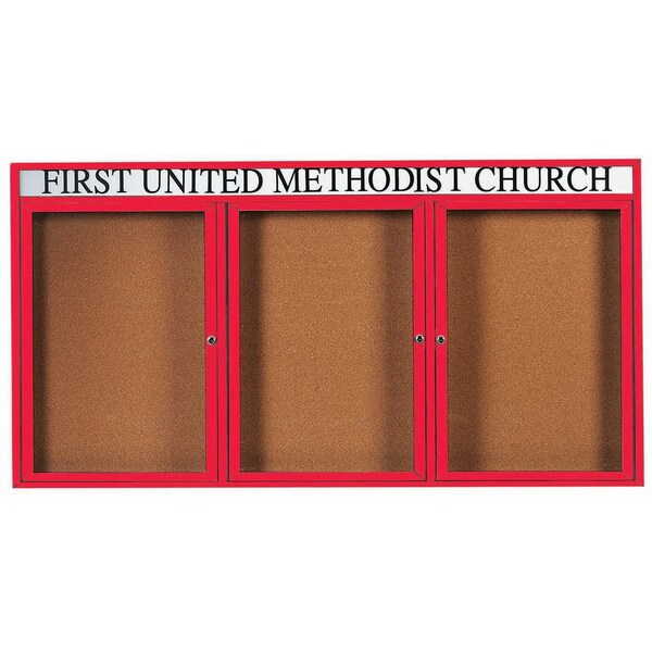 Enclosed Aluminum Bulletin Boards are made of custom extruded parts engineered to provide accurate, durable and handsome cabinets. All corners are neatly mitered and assembled with Heavy duty reinforcements and fasteners. Back panel is natural pebble grain cork. Supplied with a blank header panel, ready for your custom vinyl lettering. Lettering is not included and must be applied by the customer. Red Powder Coated Finish Size 48"Hx96"W 3 Doors