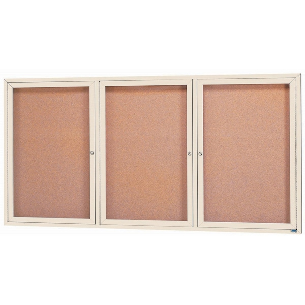 Enclosed Aluminum Bulletin Boards are made of custom extruded parts engineered to provide accurate, durable and handsome cabinets. All corners are neatly mitered and assembled with Heavy duty reinforcements and fasteners. Back panel is natural pebble grain cork. Ivory Powder Coated Finish Size 48"Hx96"W 3 Doors
