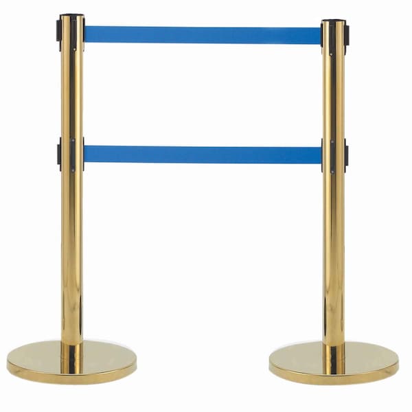 Form-A-Line Dual Retractable Belt Style Quality Crowd Control System is perfect for banks, motor vehicle agencies, cafeterias and all areas where organized queuing is required. This quality Crowd Control System uses dual retractable belts and is easy to assemble. Great in any area where organized queuing is required. The overall height is 40". The post attaches to a 30lb base, with protective floor guards, for stability. Color Brass Finish With Dual 7' Retractable Blue Belts.