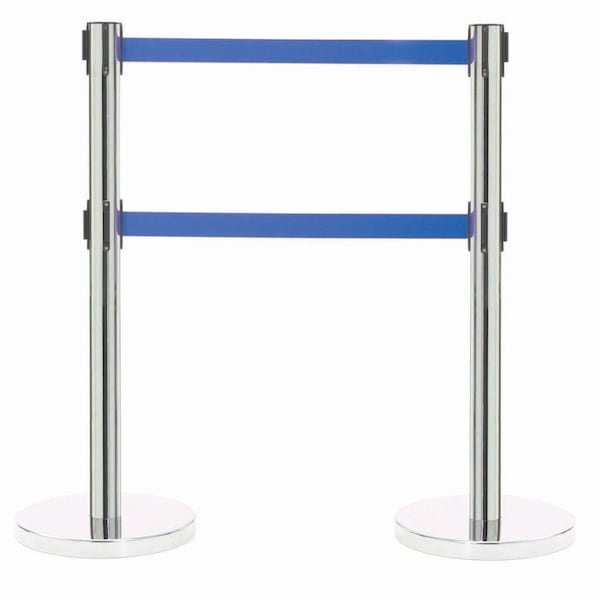 Form-A-Line Dual Retractable Belt Style Quality Crowd Control System is perfect for banks, motor vehicle agencies, cafeterias and all areas where organized queuing is required. This quality Crowd Control System uses dual retractable belts and is easy to assemble. Great in any area where organized queuing is required. The overall height is 40". The post attaches to a 30lb base, with protective floor guards, for stability. Color Satin Finish With Dual 7' Retractable Blue Belts.