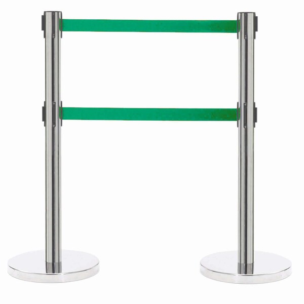 Form-A-Line Dual Retractable Belt Style Quality Crowd Control System is perfect for banks, motor vehicle agencies, cafeterias and all areas where organized queuing is required. This quality Crowd Control System uses dual retractable belts and is easy to assemble. Great in any area where organized queuing is required. The overall height is 40". The post attaches to a 30lb base, with protective floor guards, for stability. Color Chrome Finish With Dual 7' Retractable Green Belts.