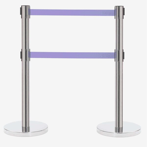 Form-A-Line Dual Retractable Belt Style Quality Crowd Control System is perfect for banks, motor vehicle agencies, cafeterias and all areas where organized queuing is required. This quality Crowd Control System uses dual retractable belts and is easy to assemble. Great in any area where organized queuing is required. The overall height is 40". The post attaches to a 30lb base, with protective floor guards, for stability. Color Chrome Finish With Dual 7' Retractable Purple Belts.