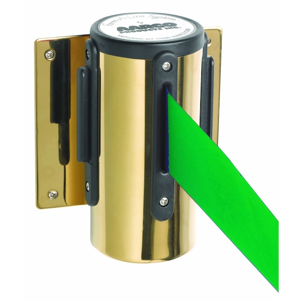 Form-A-Line System, Wall Mounted Retractable Belt w/ a Brass Casing, 7' Green Belt