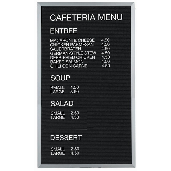 A classic black felt covered board that is precision grooved on 1/4" centers to accept universal quick change letters handsomely framed in Aluminum. Size 60"Hx36"W