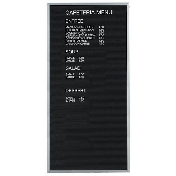A classic black felt covered board that is precision grooved on 1/4" centers to accept universal quick change letters handsomely framed in Aluminum. Size 96"Hx48"W