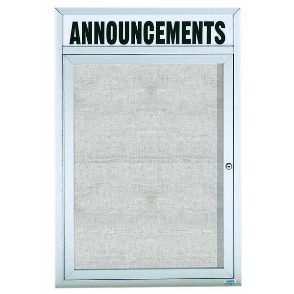Illuminated Outdoor Enclosed Aluminum Bulletin Boards are made of custom extruded parts engineered to provide accurate, durable and handsome cabinets. All corners are neatly mitered and assembled with Heavy duty reinforcements and fasteners. Units are weatherized. Back panel is an attractive standard vinyl. Supplied with a blank header panel, ready for your custom vinyl lettering. Lettering is not included and must be applied by the customer. Finish Clear Satin Anodized Size 24"Hx18"W 1 Door