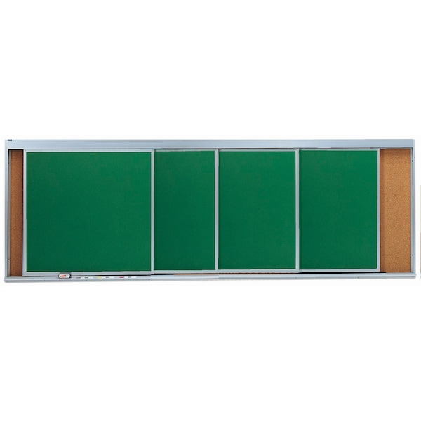 Horizontal Sliding Units maximize the use of valuable wall space. Unit has two sliding Vitre Steel High Gloss White Markerboards and One Fixed Natural Pebble Grain Cork Tackable Back panel. Size 48"Hx192"W