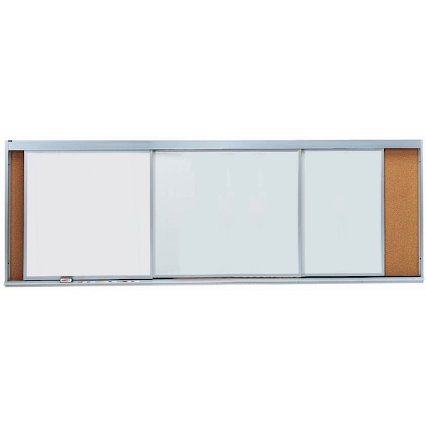 Horizontal Sliding Units maximize the use of valuable wall space. Unit has three sliding Vitre Steel Green Porcelain Chalkboards and One Fixed Natural Pebble Grain Cork Tackable Back panel. Size 48"Hx144"W
