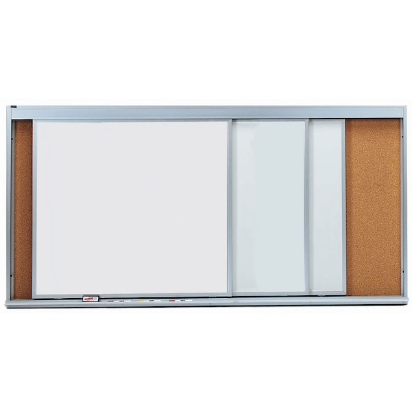 Horizontal Sliding Units maximize the use of valuable wall space. Unit has three sliding Vitre Steel Green Porcelain Chalkboards and One Fixed Natural Pebble Grain Cork Tackable Back panel. Size 48"Hx96"W