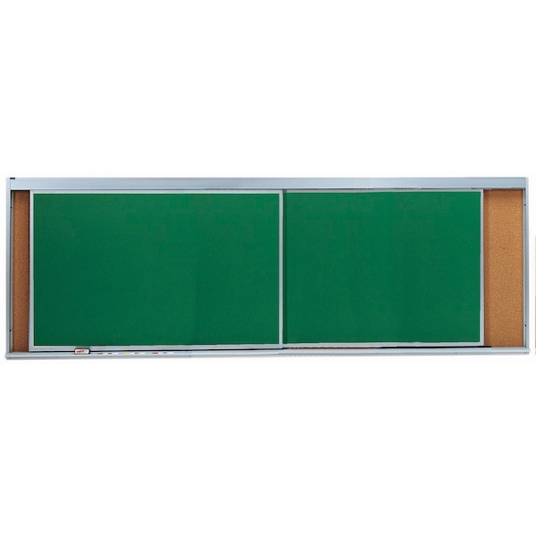 Horizontal Sliding Units maximize the use of valuable wall space. Unit has three sliding Vitre Steel High Gloss White Markerboards and One Fixed Natural Pebble Grain Cork Tackable Back panel. Size 48"Hx144"W