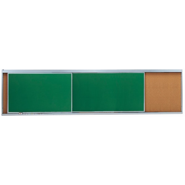 Horizontal Sliding Units maximize the use of valuable wall space. Unit has three sliding Vitre Steel High Gloss White Markerboards and One Fixed Natural Pebble Grain Cork Tackable Back panel. Size 48"Hx192"W
