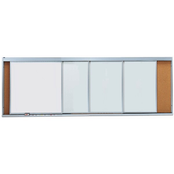 Horizontal Sliding Units maximize the use of valuable wall space. Unit has four sliding Vitre Steel Green Porcelain Chalkboards and One Fixed Natural Pebble Grain Cork Tackable Back panel. Size 48"Hx144"W