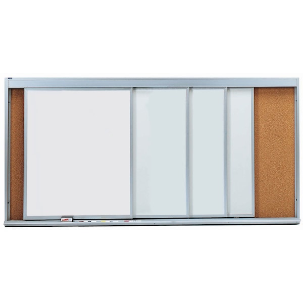 Horizontal Sliding Units maximize the use of valuable wall space. Unit has four sliding Vitre Steel Green Porcealin Chalkboards and One Fixed Natural Pebble Grain Cork Tackable Back panel. Size 48"Hx96"W