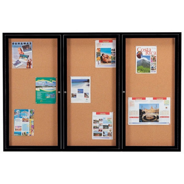 Illuminated Enclosed Aluminum Bulletin Boards are made of custom extruded parts engineered to provide accurate, durable and handsome cabinets. All corners are neatly mitered and assembled with Heavy duty reinforcements and fasteners. Back panel is natural pebble grain cork. Black Powder Coated Finish Size 48"Hx72"W 3 Doors