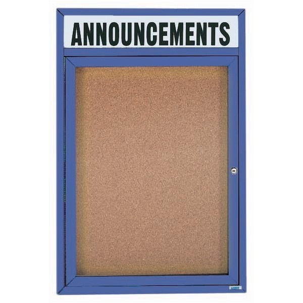 Illuminated Enclosed Aluminum Bulletin Boards are made of custom extruded parts engineered to provide accurate, durable and handsome cabinets. All corners are neatly mitered and assembled with Heavy duty reinforcements and fasteners. Back panel is natural pebble grain cork. Supplied with a blank header panel, ready for your custom vinyl lettering. Lettering is not included and must be applied by the customer. Blue Powder Coated Finish Size 24"Hx18"W 1 Door