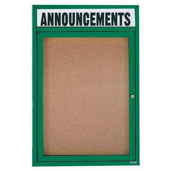 Illuminated Enclosed Aluminum Bulletin Boards are made of custom extruded parts engineered to provide accurate, durable and handsome cabinets. All corners are neatly mitered and assembled with Heavy duty reinforcements and fasteners. Back panel is natural pebble grain cork. Supplied with a blank header panel, ready for your custom vinyl lettering. Lettering is not included and must be applied by the customer. Green Powder Coated Finish Size 24"Hx18"W 1 Door