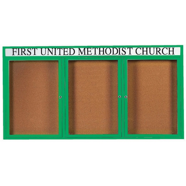 Illuminated Enclosed Aluminum Bulletin Boards are made of custom extruded parts engineered to provide accurate, durable and handsome cabinets. All corners are neatly mitered and assembled with Heavy duty reinforcements and fasteners. Back panel is natural pebble grain cork. Supplied with a blank header panel, ready for your custom vinyl lettering. Lettering is not included and must be applied by the customer. Green Powder Coated Finish Size 36"Hx72"W 3 Doors